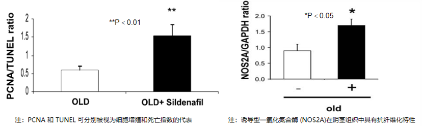 Ferrini MG等人进行了动物实验,在老龄雄性大鼠(20月龄)的饮用水(每天20 mg/kg)或白开水中给予西地那非45天,将未处理的幼龄大鼠(5月龄)作为对照组(每组n=8)。