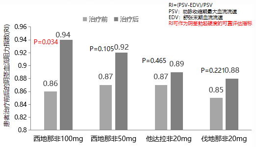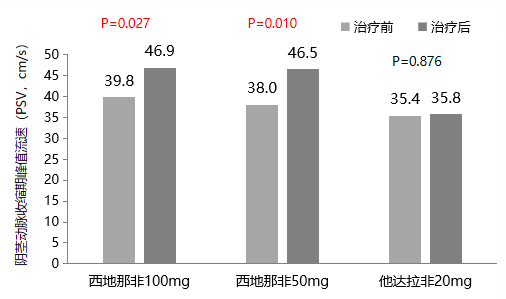 研究结果显示,规律使用西地那非可显著改善阴茎血流阻力指数(RI)和阴茎动脉收缩期峰值流速(PSV)。