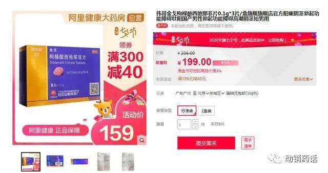 在淘宝上,阿里大药房金戈标价为199元一盒,按照一盒3片计算,即均价66.33元。这意味着,伟哥金戈的价格是齐鲁制药的国产伟哥中标价格(2.0817元/片)的33倍。