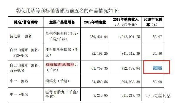 例如,白云山2019年年报显示,金戈(国产伟哥)的毛利率高达90.65%。假设卖100元的金戈,白云山的毛利数额有90.65元(即100元乘以毛利率90.65%)。
