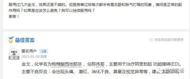 顺便一提,万艾可是原研药,金戈是仿制药。原研药与仿制药的区别在于后者存在有杂质、纯度不高的问题,甚至还有副作用。在网上,有使用者反映存在胃反酸、胀气打嗝的现象。