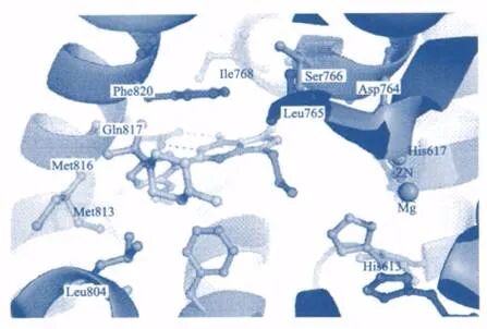 因此,在化合物3的3位引人较大的取代基可能会填充至PDE活性中心原先被核糖占据的空间,在苯环5位引入取代基可能将替代磷酸酯在结合时所起的角色。