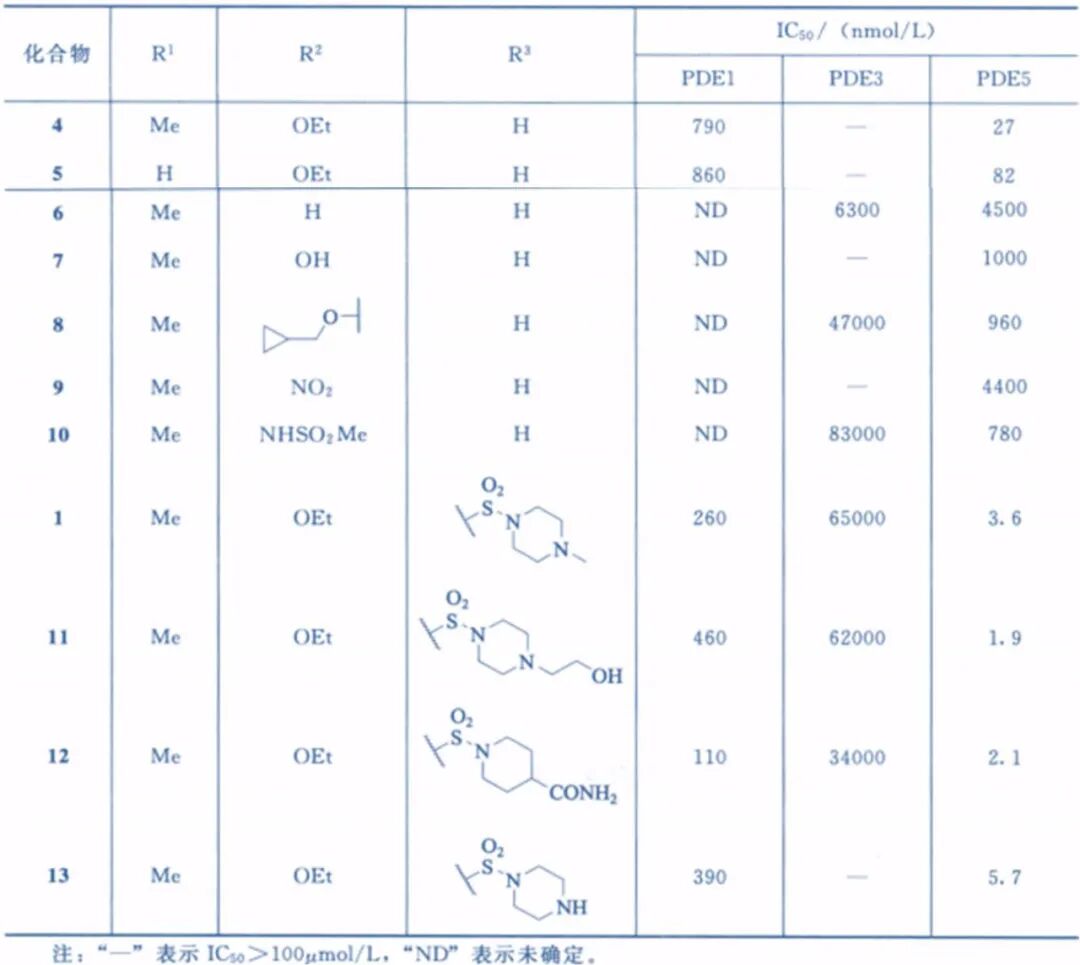 其中母核为吡唑并[4,3-d]嘧啶-7-酮类化合物的活性和选择性有了明显的提高,如化合物3。