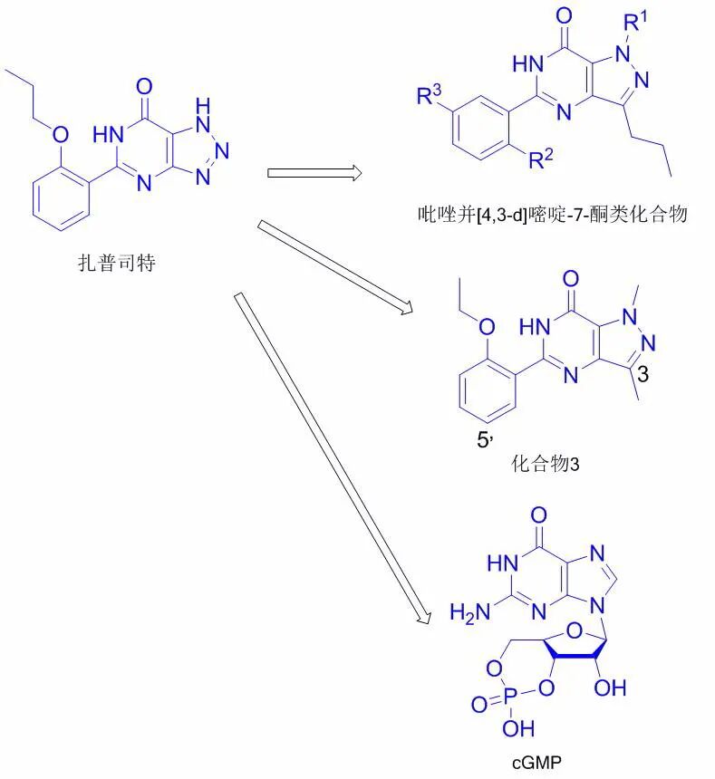 基于以上分析,研究人员对吡唑并[4,3-d]嘧啶-7-酮类化合物进行了衍生合成: