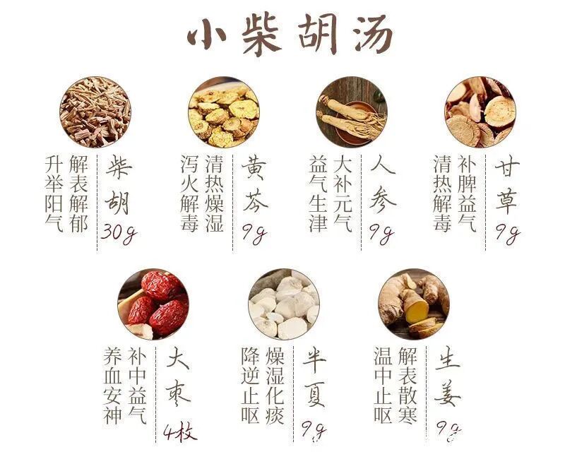 主要成分:柴胡、姜半夏、黄芩、党参、甘草、生姜、大枣。