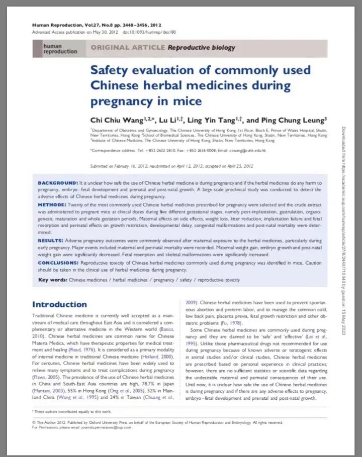 ▎2012年,香港中文大学中医药研究所在牛津大学《人类生殖》杂志上发表文章,报告了利用20多种中草药投喂给孕期小鼠所得到的结果。研究表明,包括白芍、紫铃草、温德颜、砂仁、生地黄、菟丝子、红豆杉等在内的20种中草药,都会导致一系列毒性反应,影响胎儿发育,甚至出现死产、产后死亡、出生迟缓或致畸等问题。研究小组郑重建议:孕期临床应用草药应慎重。