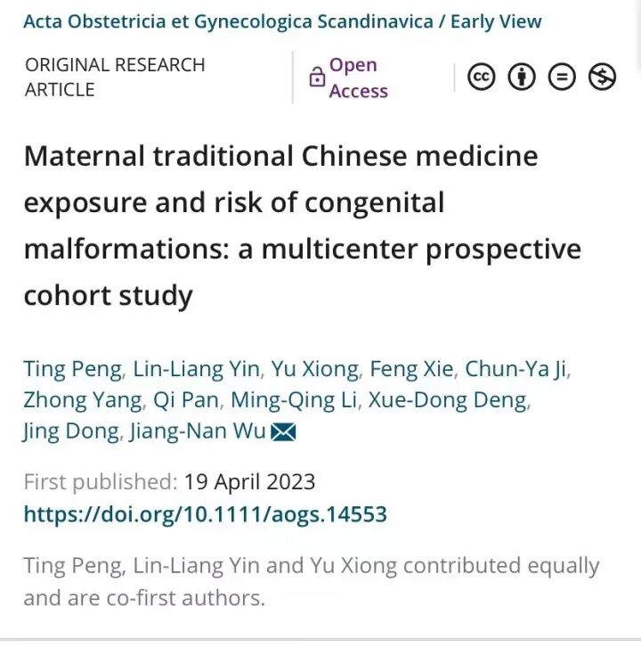 出乎意料的是,一份发表在《斯堪的纳维亚妇产科学报》的《孕妇中药暴露与先天性畸形风险:一项多中心前瞻性队列研究》,表明妊娠早期和孕前半年服用中草药,也可能给新生儿带来风险,导致先天畸形[1]。