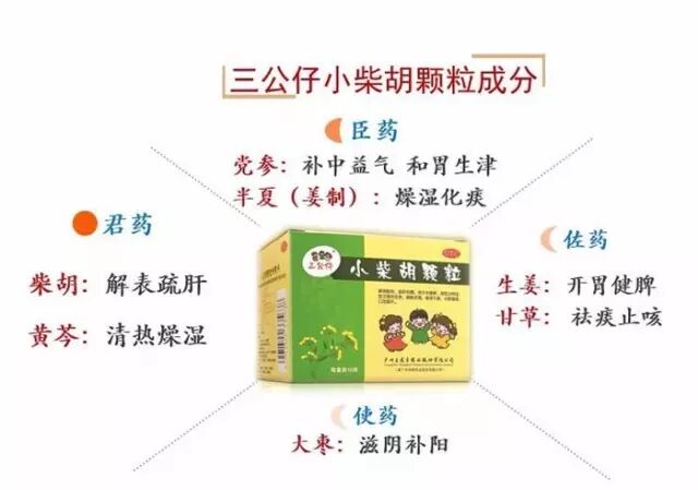 三公仔小柴胡颗粒配方中,柴胡和黄芩是君药,根据现代药理研究证明,柴胡具有疏散退热,疏肝解郁,升举阳气,用于感冒发热,寒热往来等;黄芩能清泻少阳半里之邪,二药相配和解少阳之功。党参和半夏为臣药,《本草从新》所载党参补中益气,和脾胃除烦渴,起到和胃和降逆止呕的作用;使药大枣扶正益气健脾,佐药生姜和甘草起到调和诸药的功效。