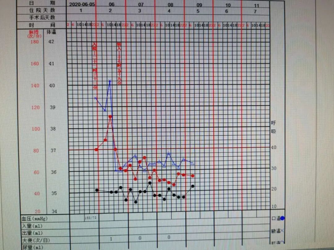 下图为患者生命体征单,蓝色的代表体温,自服中药后,连续三日体温一直未超过37℃。