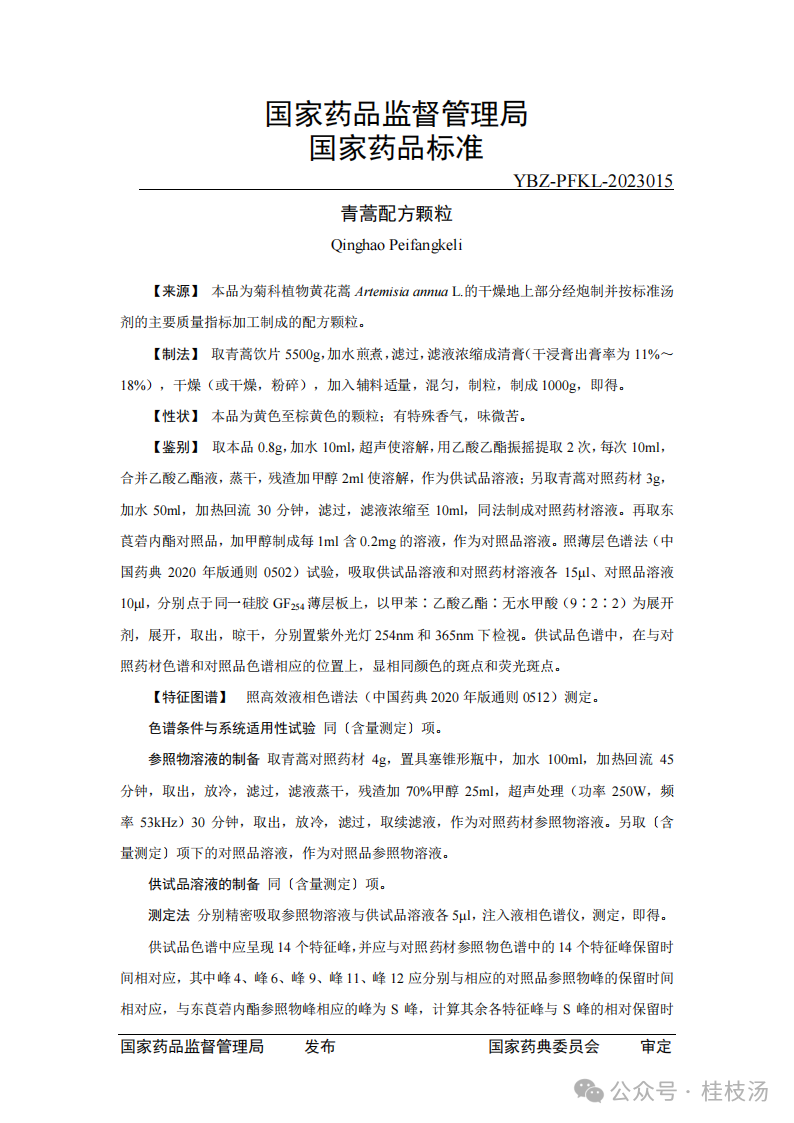 五、选择中药饮片,还是配方颗粒?青蒿配方颗粒是用青蒿饮片,经过加水煎煮,浓缩后,加入辅料制成的颗粒剂,具有和青蒿饮片一样的功效。在质量控制中,检测含量时,采用取绿原酸对照品、1,3-O-二咖啡酰奎宁酸对照品、东莨菪内酯对照品、3,5-O-二咖啡酰奎宁酸对照品、4,5-O-二咖啡酰奎宁酸对照品,对照品、供试品依次进样后,外标法计算含量。只有符合国家标准的青蒿配方颗粒才可以上市。