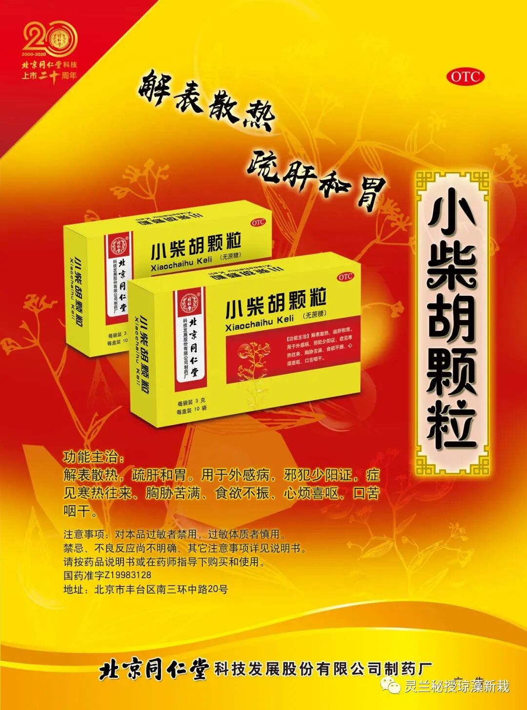 北京同仁堂的小柴胡颗粒,出自于东汉张仲景著《伤寒论》113个名方之一小柴胡汤。由七味药柴胡、黄芩、人参、半夏、甘草、大枣组成。小柴胡汤具有解表散热、疏肝和胃的功效。素有少阳枢机之剂,和解表里之总方之称,是临床上治疗少阳病的基础方如柴胡桂枝汤,柴胡去半夏加瓜蒌汤,柴胡加龙骨牡蛎汤等,拓展了很多病症范围。