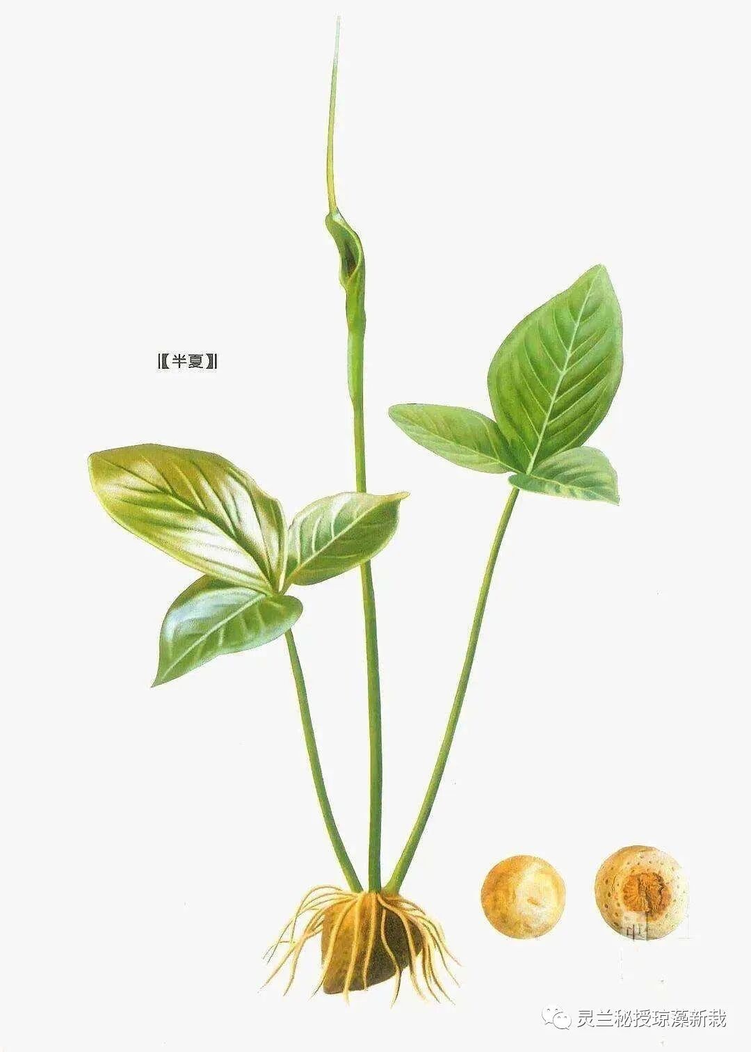 【半夏】半夏性味辛、温;有毒。归脾、胃、肺经。具有燥湿化痰,降逆止呕,消痞散结的功效。用于湿痰寒痰,咳喘痰多,痰饮眩悸,风痰眩晕,痰厥头痛,呕吐反胃,胸脘痞闷,梅核气;外治痈肿痰核。现代医学研究表明,半夏有止咳、祛痰、镇吐、抑制胃液分泌、促进胆汁分泌、抗肿瘤、抗心律失常、镇静催眠、降血脂、抑菌、抗炎、增强免疫、利尿等多种药理作用。由于该药材具有一定毒性,故医生会根据病情使用一定限定克数的清半夏、法半夏、姜半夏等不同炮制药材。常用名方如小半夏汤、小青龙汤、小陷胸汤、半夏厚朴汤、大半夏汤、半夏白术天麻汤等。
