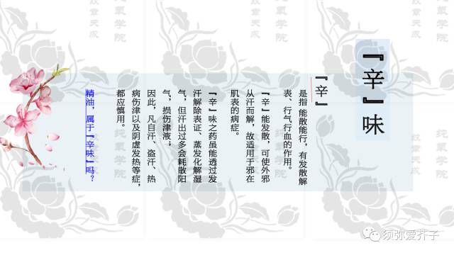 那其实就这个问题呢,我也拿了精油去请教我的一个中医的老师。当他知道了这个精油的来由之后。他就说在中医里面,我们是不承认精油有这么多的作用的,为什么呢?因为在中医里面,如果是以这样的方式出现的药材。我们会把它归类为辛味,就是我们刚才所说的五味当中的辛味。
