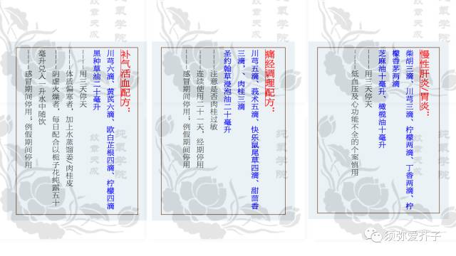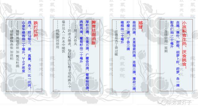 我经过自己、身边信任我的个案的一段时间的使用后,慢慢摸索出了一些经验。我觉得,可能从这些经验去看,对于使用中药精油来说,我们就会去掉很多原有的顾忌,起码对我个人来说,我觉得它给我放开了使用精油的意识上面或者思想上面的束缚,所以今天我也把它跟大家做下分享。