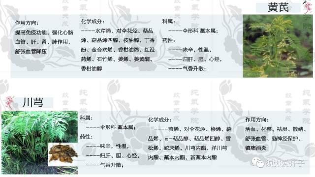 那同样它的作用方向是活血化瘀,因为它能够推动气血行走,所以,它又有祛除湿气,打散结节的功效,它在心血脑系统的保护上面也有很大功效,这几个内酯它是属于这个内酯的成份,内酯这一大类的化学成分,有一个很大的功效,就是放松。所以,它在镇痛消炎上面也有很好的一个体现。