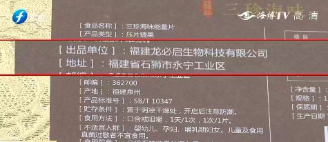 这款神奇的药到底长什么样呢?尹先生当场从包里掏出了两个盒子,可以看到,这款产品包装精美,金灿灿的盒子正面印着名称三珍海味能量片,上面标注着100%纯天然,在背后的产品介绍上写着这是由泉州石狮市一家名为龙必启生物科技有限公司的企业生产的压片糖果。