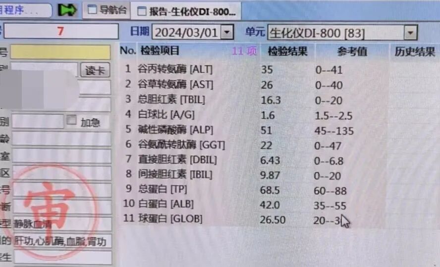 三诊,谷丙转氨酶降到35U/L,谷草转氨酶降到26U/L。