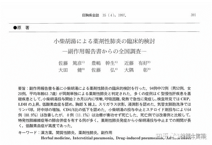 1997年,滨松医科大学的佐藤笃彦等人分析了自1990年1月至1996年月间日本全国94例小柴胡汤颗粒相关药物性肺炎的数据,发表了题为小柴胡汤导致药物性肺炎的临床检讨:基于副作用报告书的全国调查研究论文[Sato A, et al. Pneumonitis induced by the herbal medicin Sho-saiko-to in Japan. Nihon Kyobu Shikkan Gakkai Zasshi. 1997 Apr;35(4):391-5.],见图2。根据该研究,多数病例因慢性丙肝服用小柴胡汤,而且是长期服用——从开始服用小柴胡汤到出现肺炎症状,平均天数高达50.2天,这些病人的平均年龄也偏高,达63.7岁。也就是长期服用和老年人是小柴胡汤引起的间质性肺炎的特点。