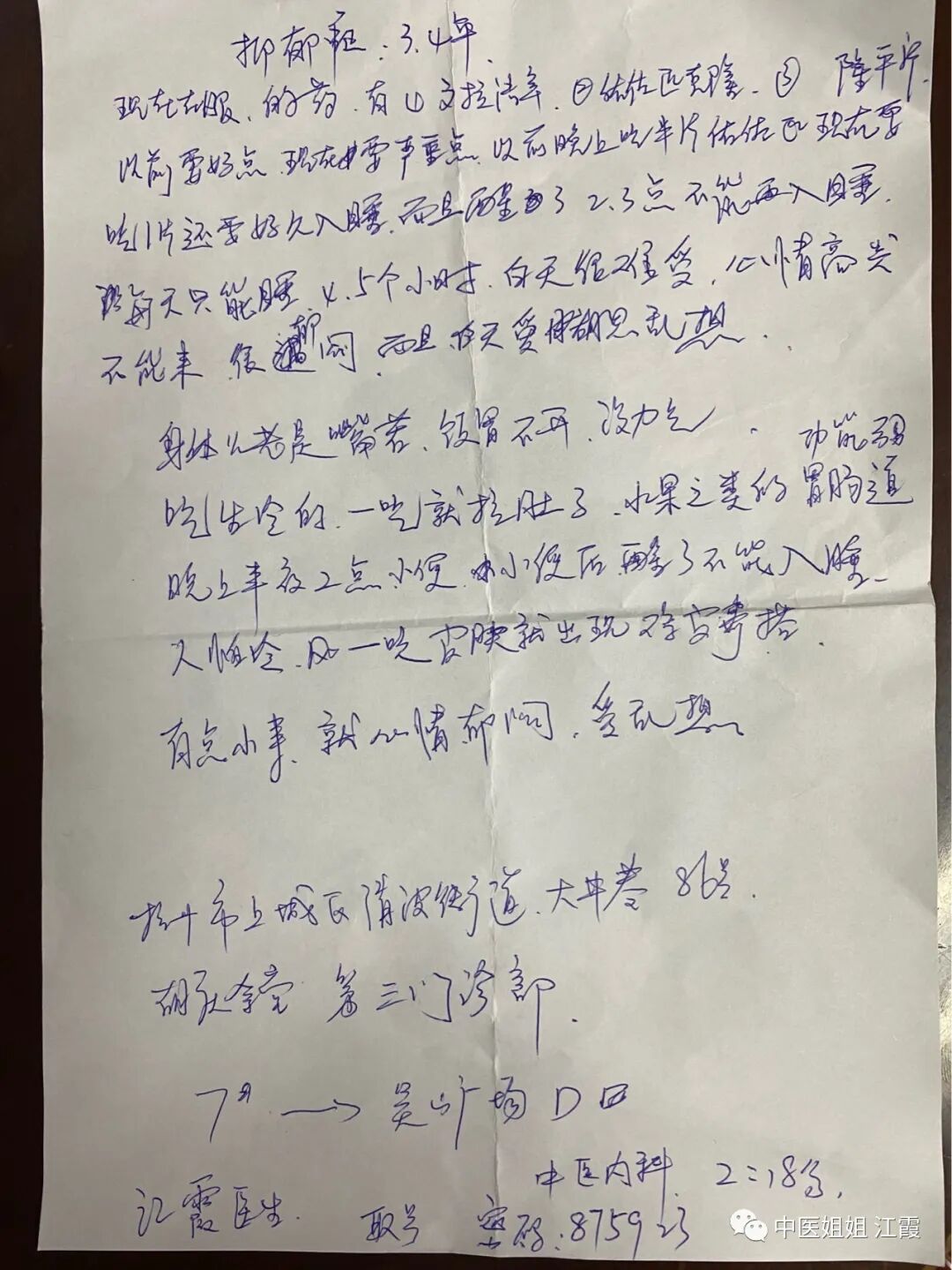 从这张纸上可以知道,小L患抑郁症有四年时间,失眠、不开心、胡思乱想、没有兴趣,还有很多躯体不舒服的症状。服用西药也有四年时间,效果不理想,抑郁的症状还是很明显。