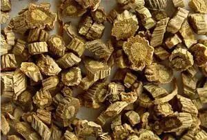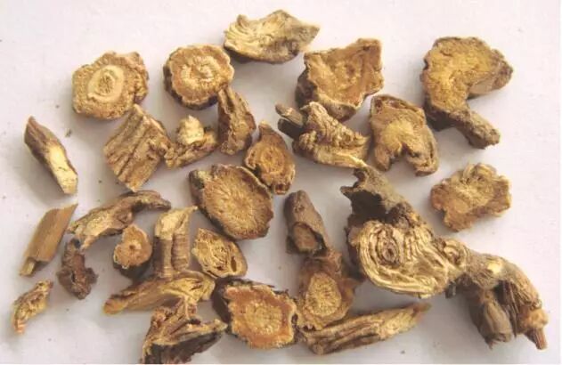 D前胡饮片:本品呈类圆形或不规则的薄片,外表皮黑褐色或灰黄色,有时可见残留的纤维状叶鞘残基,切面黄白色至淡黄色,皮部散有多数棕黄色油点,可见一棕色环及放射状纹理。