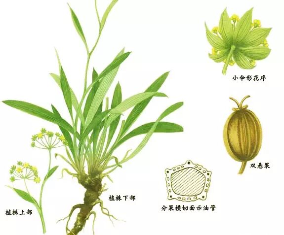 A防风饮片:为圆形或长圆形的厚片,外皮灰棕色,粗糙。横切面有裂隙,皮部浅棕色,散布黄棕色油点,木部浅黄色,形成层环棕色。有的中央有髓。