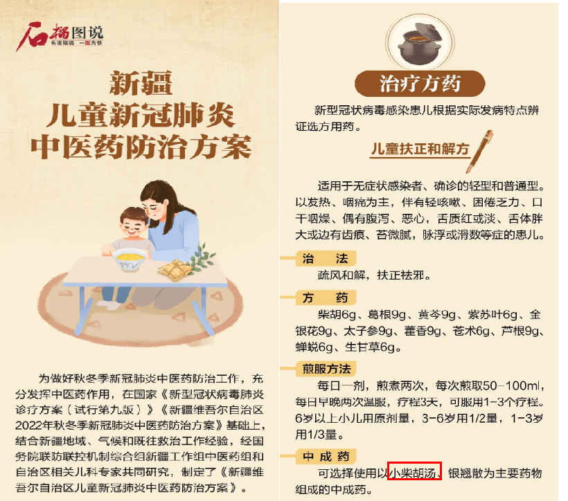 新疆疫情历时数月,在防控和治疗中累计了宝贵的经验,新疆在2022年11月8日发布了《新疆儿童新冠肺炎中医药防治方案》,小柴胡汤被推荐儿童发热、咽痛的治疗方。