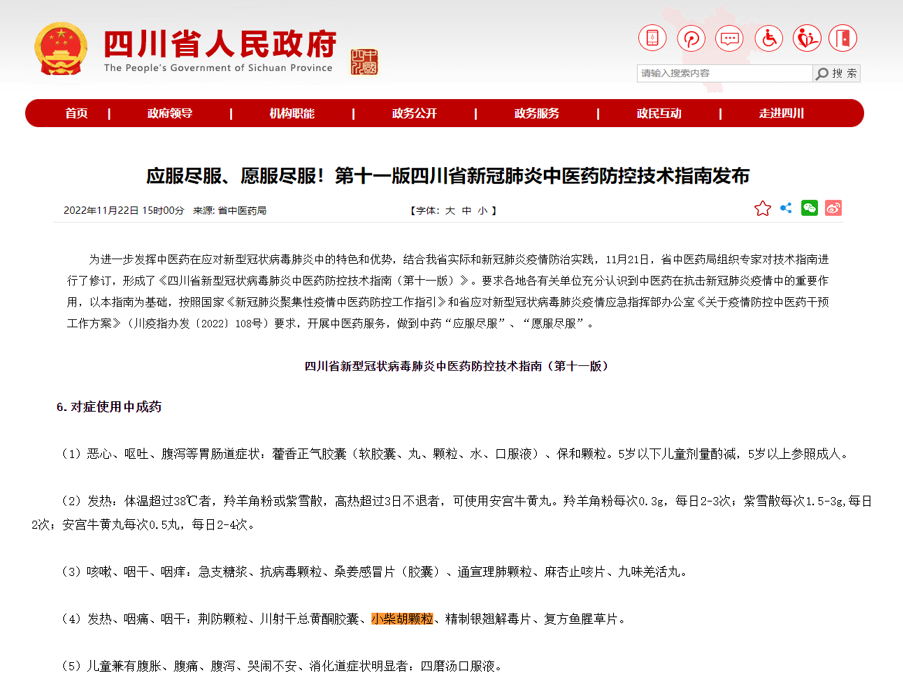 四川省2022年11月22日发布《第十一版四川省新冠肺炎中医药防控技术指南》,小柴胡颗粒被列入发热、咽痛、咽干的治疗方!