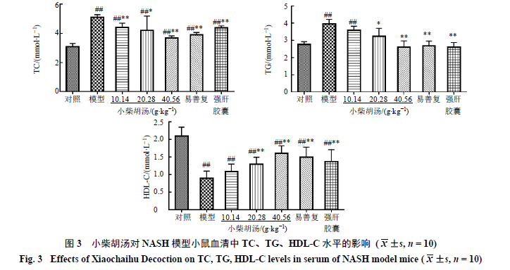 与对照组相比,模型组小鼠血清中TC、TG水平均极显著升高(P<0.01),HDL-C水平极显著降低(P<0.01);与模型组相比,小柴胡汤高剂量组、易善复组、强肝胶囊组小鼠血清中TC、TG水平极显著降低(P<0.01),小柴胡汤中剂量组小鼠血清中TC、TG水平显著降低(P<0.05);小柴胡汤中、高剂量组及易善复组、强肝胶囊组小鼠血清HDL-C水平极显著升高(P<0.01),说明小柴胡汤可显著调节NASH小鼠的血脂水平且呈现剂量相关性。结果见图3。