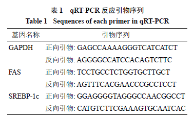 2.3.4qRT-PCR检测相关基因取各组小鼠冻存的部分肝组织,按照说明书提取总RNA,并逆转录合成cDNA。对FAS、SREBP-1c采用实时荧光定量PCR仪进行相对定量分析,目标基因的相对定量用2−ΔΔCt公式计算,实验所需各引物序列见表1。