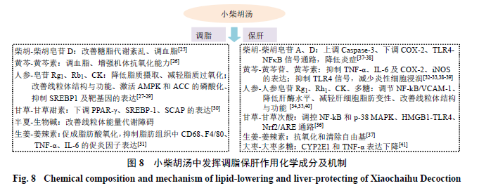 目前针对NASH不同发病机制的多种新型靶向药物已经相继进入临床试验[21-23],但受限于潜在不良反应尚未得到一致认可。在整体观念和辨证论治的指导下,中医对NASH认识的逐渐清晰,治疗原则也逐渐呈现多样化。小柴胡汤可针对NASH痰、湿、气滞、血瘀、热的病理因素[24],诸药合用发挥化痰浊、畅三焦、行气机、解郁结、和枢机之功效。现有研究表明,小柴胡汤在改善肝组织功能、调节脂质代谢上具有明显的疗效和优势[11]。方中所含柴胡皂苷、黄芩苷等主要化学成分可发挥调节脂质代谢、抗氧化、抗凋亡、免疫调节、抗炎等功能保护肝脏组织[25-41],见图8。