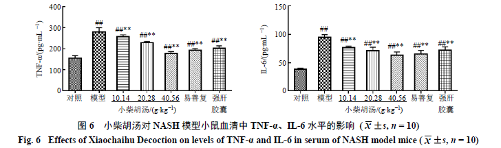 3.6小柴胡汤对NASH模型小鼠血清中促炎细胞因子TNF-α、IL-6水平的影响