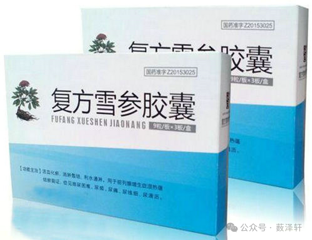 三、复方雪参胶囊:前列腺增生,小便涩痛,夜尿频繁。