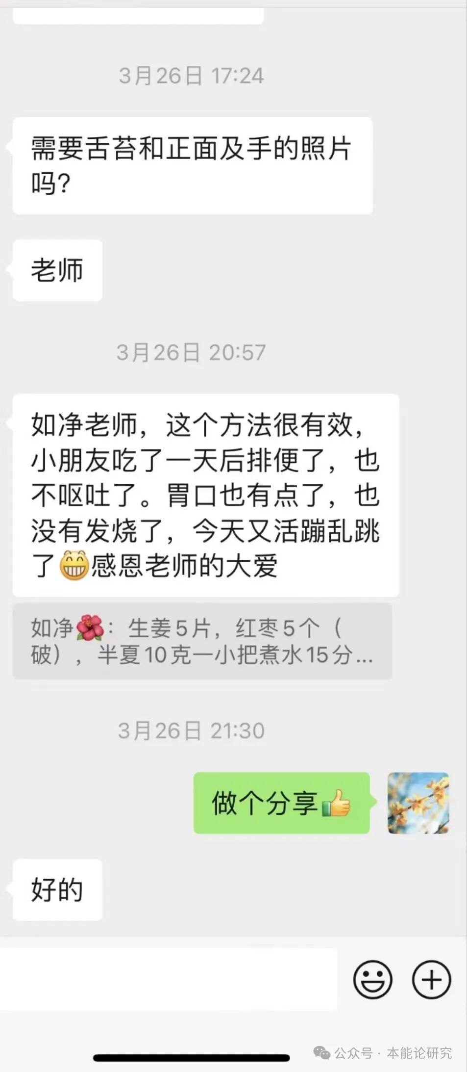 总体说来,二次加味的小柴胡颗粒吃完后,孩子的症状便完全消失。感慨啊,一方面孩子的恢复能力真是快啊,一方面用对方法真的是比西医不知道快了多少倍啊!我们有多少人现在还被中医见效慢这个观念影响着。着实让人忧心呐。另一方面,觉得自己是多么幸运,可以接触到本能论,接触到那么多优秀的传承老师。我周围的人对我的信任,有什么身体疾病总是找我咨询,由于我自己是半桶水,所以一次又一次的请教如净老师。特别感谢我的指导老师如净,老师非常耐心地指导我,对我帮助特别大。