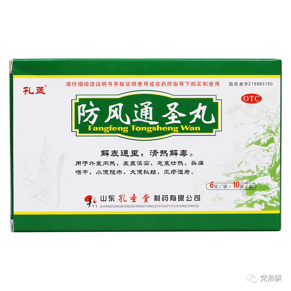 防风通圣丸:麻黄、荆芥穗、防风、薄荷、连翘、桔梗、栀子、黄芩、石膏、大黄、芒硝、滑石、当归、川芎、白芍、白术、甘草