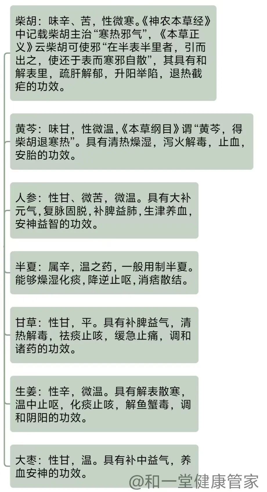 它的组成看似简单,却蕴含深意:柴胡重用为君,透散少阳之邪,疏畅经气之郁滞;黄芩为臣,苦寒清泄少阳之热;半夏和胃降逆止呕,生姜助半夏和胃之功,兼制半夏之毒,人参、大枣益气健脾、扶正祛邪,共为佐药;炙甘草益气健脾、调和诸药,既是佐药,也是使药。