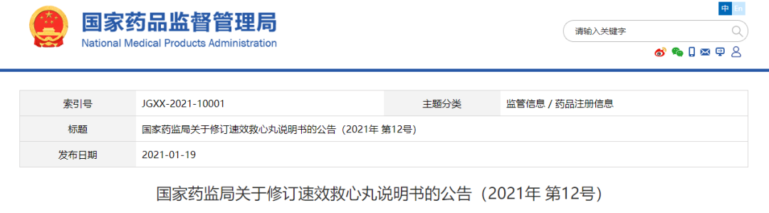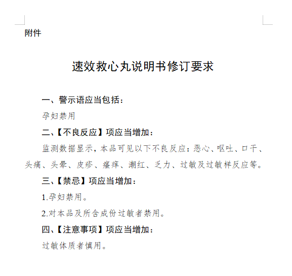 根据药品不良反应评估结果,为进一步保障公众用药安全,国家药品监督管理局决定对速效救心丸说明书的警示语、【不良反应】【禁忌】和【注意事项】项进行统一修订。现将有关事项公告如下:一、本品的上市许可持有人应依据《药品注册管理办法》等有关规定,按照相应说明书修订要求(见附件)修订说明书,于2021年4月13日前报省级药品监督管理部门备案。修订内容涉及药品标签的,应当一并进行修订;说明书及标签其他内容应当与原批准内容一致。在备案之日起生产的药品,不得继续使用原药品说明书。药品上市许可持有人应当在备案后9个月内对已出厂的药品说明书及标签予以更换。