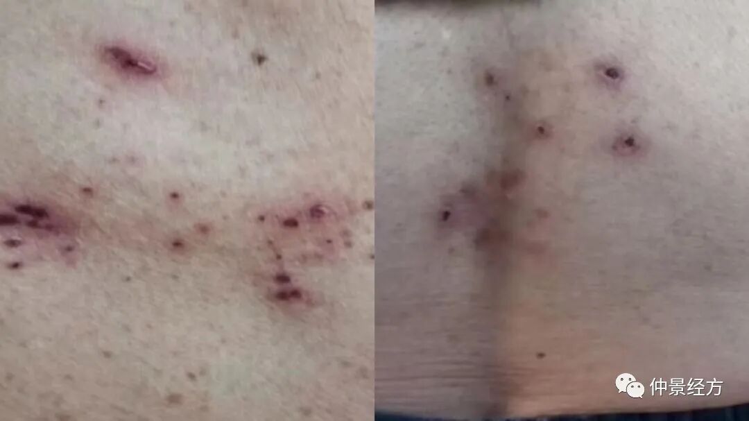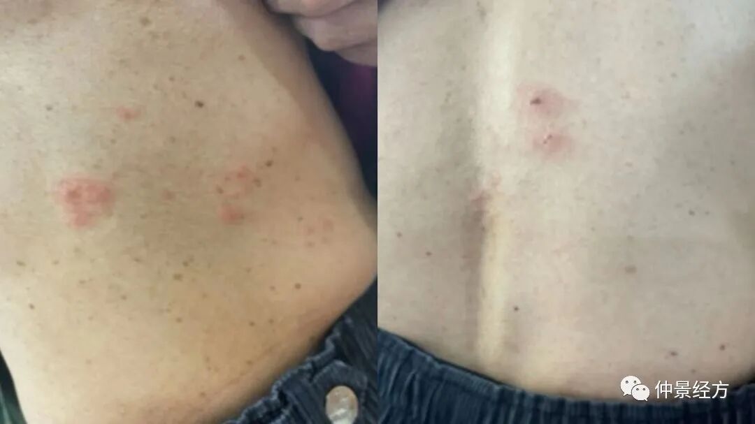 2022年11月10日第二诊:患者女儿发来照片,诉服药三剂后疼痛减轻,白天疼痛的少,夜间疼痛时多,食欲好转,恶心消失,大便一天一次,见皮肤表面潮红斑基本消退,剩下粟粒样丘疹表面有结痂。给与原方继续三剂。