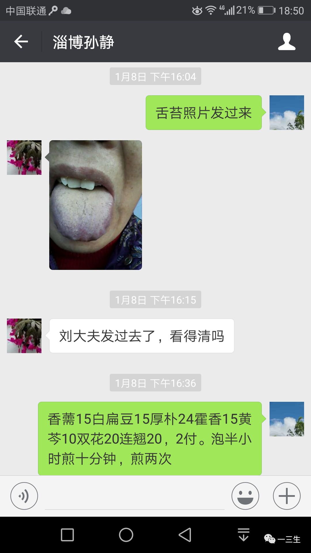 患者第二天早晨去抓中药,吃了一天后,8号下午给我打电话说:温度降下来一点,38度多点,……再怎么吃药?我一听,感到方子可能不对路,让她再发舌苔照片过来。一看舌苔,更厚腻了,马上换温病的方子——新加香薷散:香薷15白扁豆15 厚朴24 藿香15 黄芩10 双花20 连翘20 ,2剂。