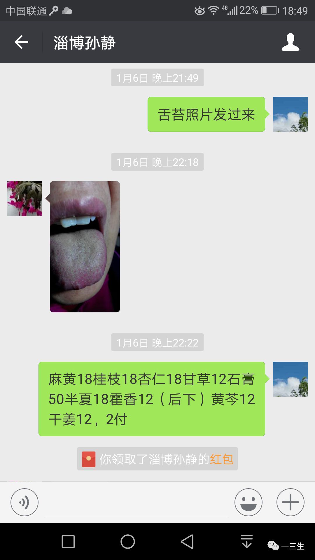 一看微信,马上想到最近治疗成人感冒发烧的常用方——麻黄汤加石膏,但是一看舌照片——舌红苔黄厚腻,又有点犹豫,因为按这个舌苔我一般会用考虑香薷散或甘露消毒丹之类的方子(都是温病的方子)。考虑再三,还是用了麻黄汤加石膏,另外加了化湿的几味药:藿香、半夏、黄芩。处方:麻黄18 桂枝18 杏仁18 甘草12 石膏50 半夏18 藿香12(后下) 黄芩12 干姜12,2剂。
