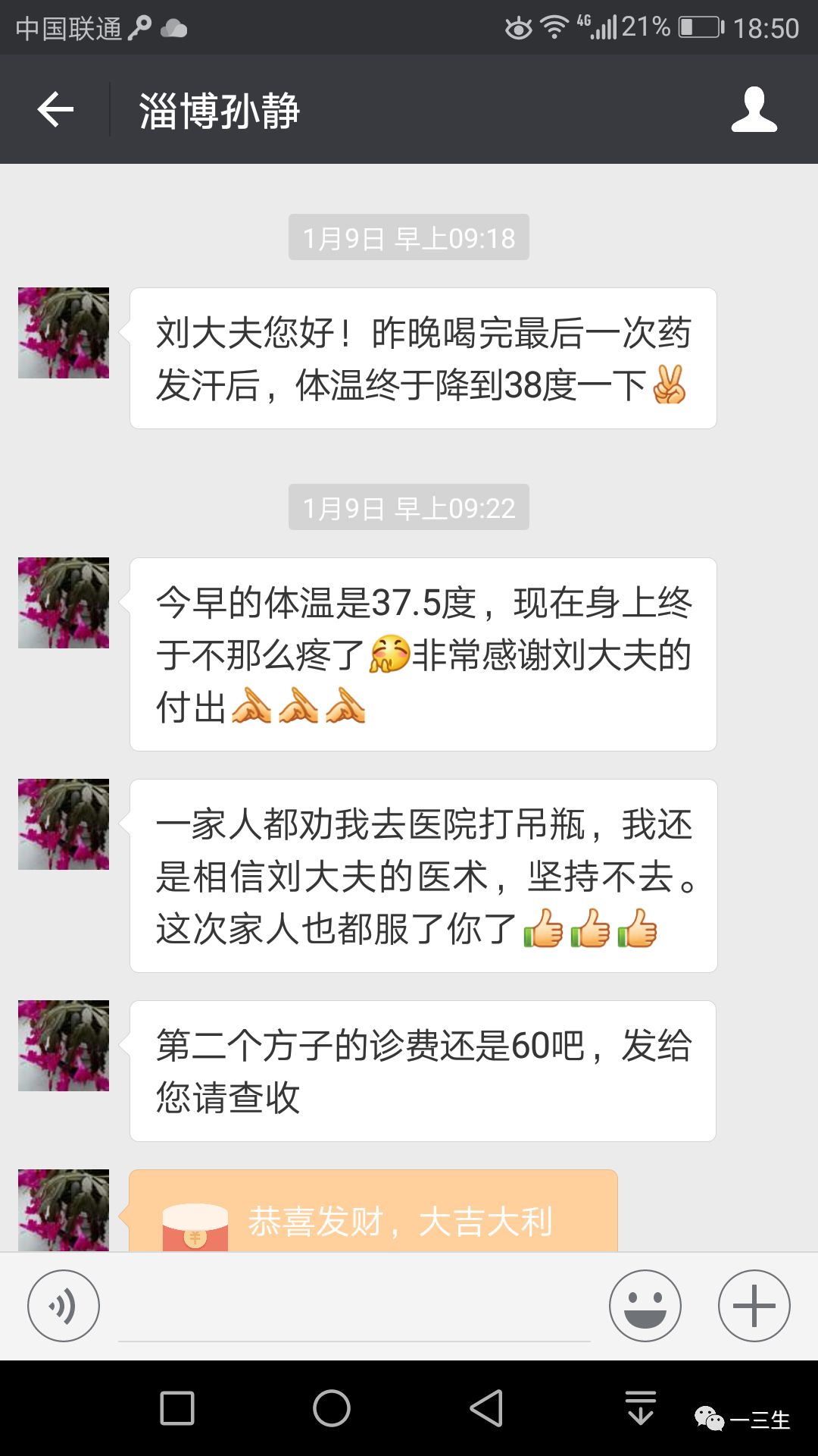 第二天(9号)早上给我发来微信:药后当晚降到了38度以下,早上37.5度,身上终于不那么疼了。服完剩下的药,就全好了。