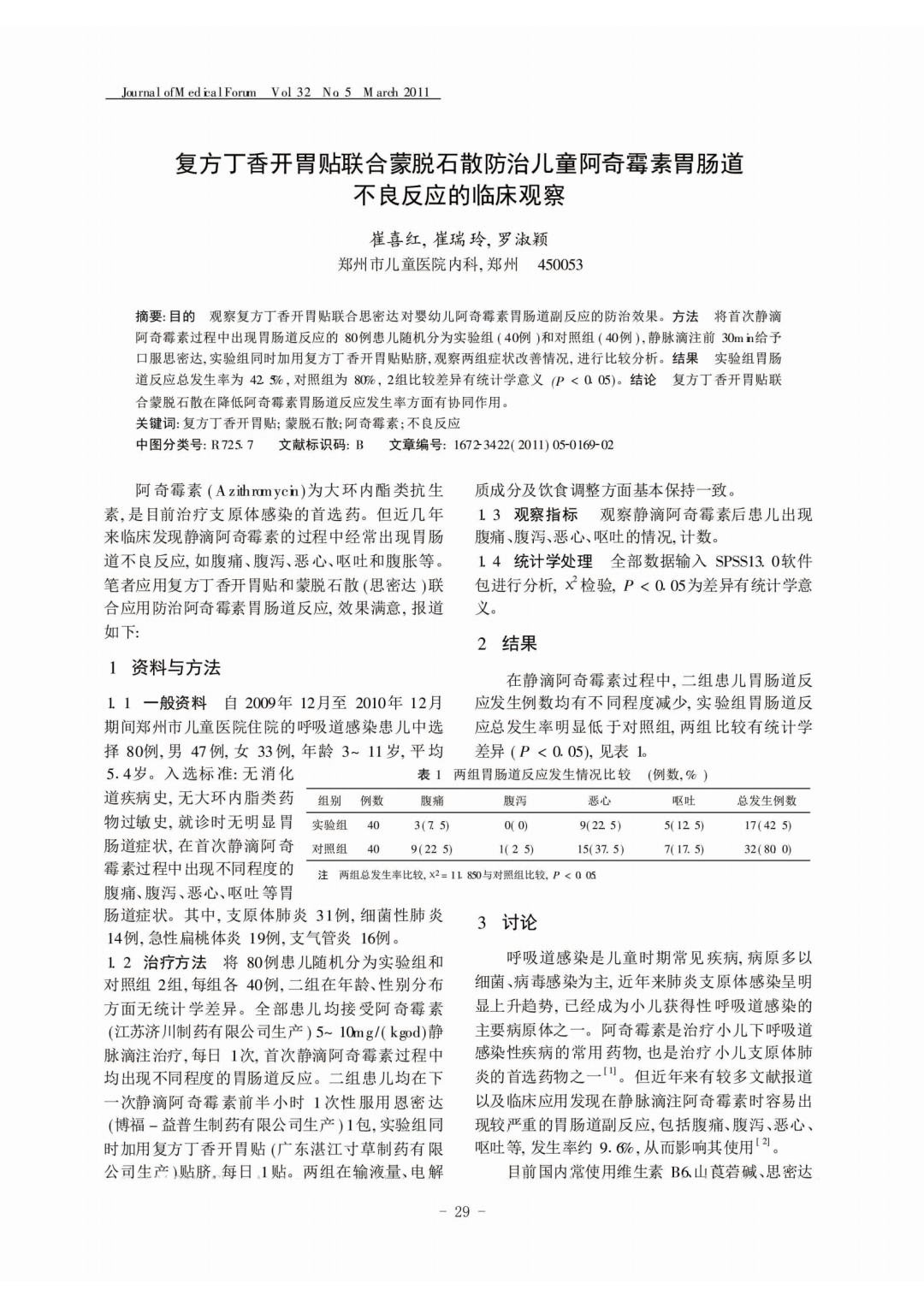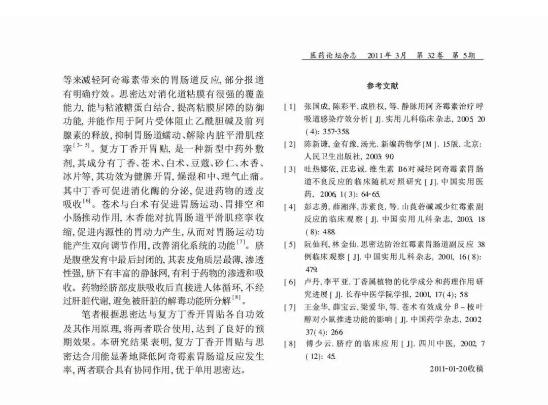 河南省郑州市儿童医院:观察复方丁香开胃贴联合思密达对婴幼儿阿奇霉素胃肠道副反应的防治效果。方法:将首次静滴阿奇霉素过程中出现胃肠道反应的 80例患儿随机分为实验组(40例)和对照组(40例)静脉滴注前30m给予口服思密达,实验组同时加用复方丁香开胃贴贴脐。观察两组症状改善情况,进行比较分析。结果:实验组胃肠道反应总发生率为 42.5%,对照组为 80%,2组比较差异有统计学意义 (P<0.05)。结论:复方香开胃贴联合蒙脱石散在降低阿奇霉素胃肠道反应发生率方面有协同作用。