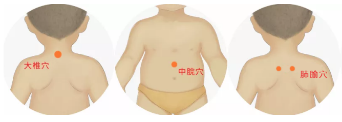 咳嗽时:重点做肺腧和前胸。如有积食、腹痛、腹泻:整个肚子,中脘、神阙是重点。