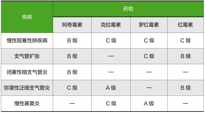 我国于 2015 年发布了《抗菌药物超说明书用法专家共识》,相比 BTS 证据总结,该专家共识中涵盖的疾病和药物种类更多。笔者对其中关于大环内酯类药物超说明书用法的证据等级评价进行了汇总: