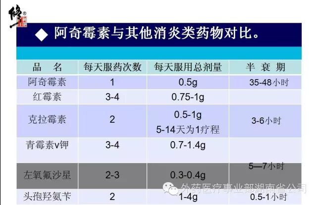⑴、阿奇霉素半衰期长,药力更持久。一天仅需口服一次。三天的用药可提供10天的治疗,提高了患者对药物的依从性。