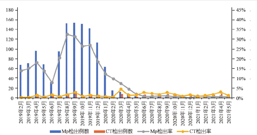 2019 年 2 月至 2021 年 5 月肺炎支原体和沙眼衣原体的季节分布 图源:参考资料 3