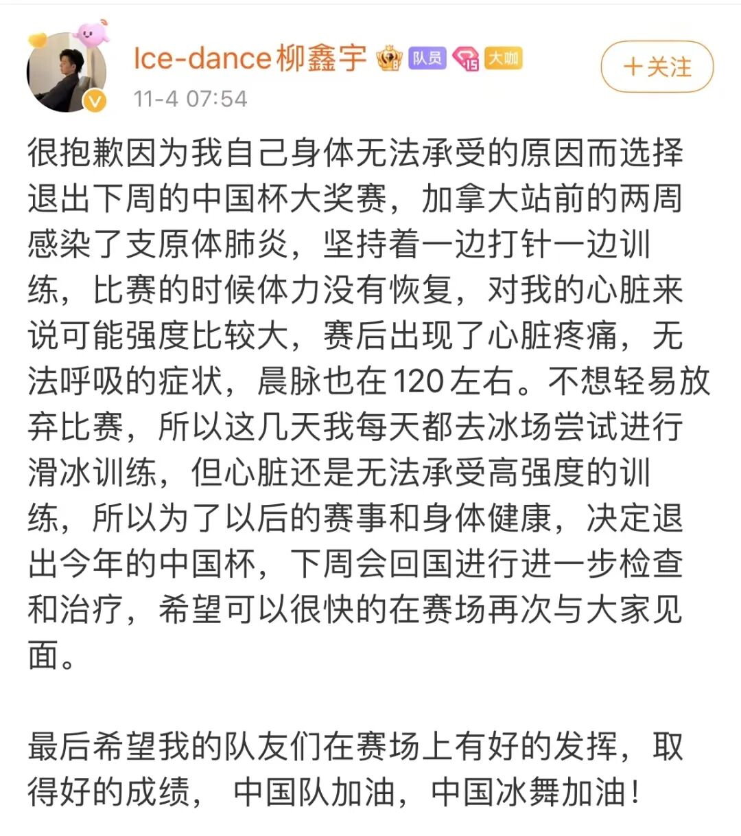 此前,柳鑫宇发文表示,因感染了支原体肺炎,心脏无法承受高强度的训练,因此决定退出中国杯。