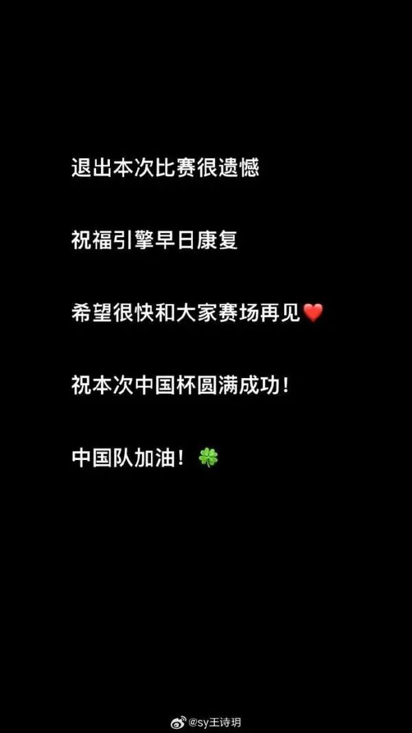 王诗玥也发微博表示,退出本次比赛很遗憾,祝福引擎早日康复,希望很快和大家赛场再见。