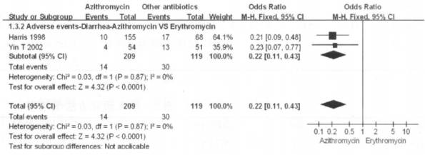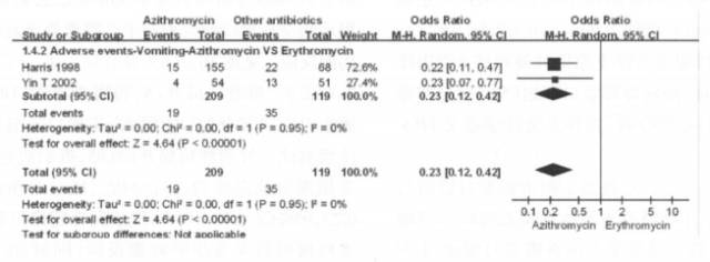 一项 Meta 分析评价了口服阿奇霉素与口服及静脉应用红霉素治疗小儿呼吸道支原体感染的疗效及安全性,最终纳入 4 项随机对照研究,共 538 例患儿(阿奇霉素口服组 319 例,对照组 219 例)。结果显示,阿奇霉素治疗 ≤15天及 ≥1 个月的疗效均优于红霉素口服治疗(图 1),同时,阿奇霉素组患儿相对于红霉素口服/静滴组均较少出现腹泻和呕吐副反应(图 2,3)6。