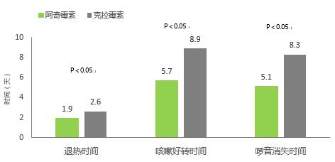 另一项研究比较阿奇霉素与克拉霉素治疗小儿支原体肺炎研究的疗效,共纳入100 例患儿,阿奇霉素组(n=50):阿奇霉素10mg/d,qd,服用 3 天后停药4 天为一疗程,克拉霉素组(n=50):克拉霉素 15mg/kg,bid,服用 5 天后停药 2 天为一疗程,对于 1 个疗程未好转者可继续服用 1 个疗程。结果显示,服用阿奇霉素治疗的患儿在症状缓解时间及疗效上均显著优于应用克拉霉素治疗的患儿8。