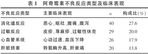 有研究对阿奇霉素不良反应 145 例进行分析,发生的不良反应以消化道反应占首位,过敏反应其次。见表 1。